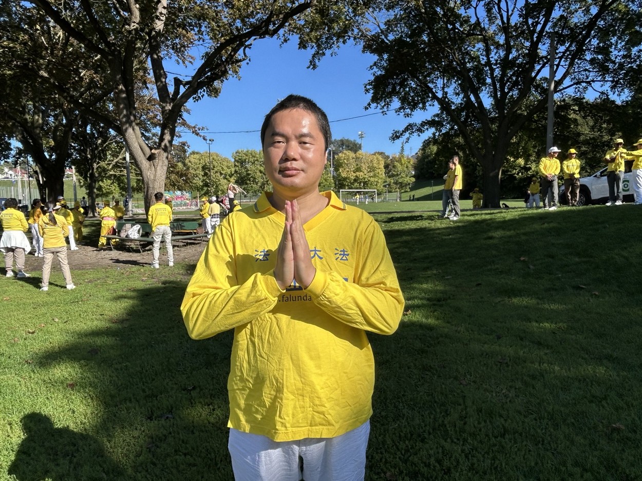 2025年9月28日,多伦多法轮功学员王杨恭祝李洪志师父中秋快乐。他说:「每当我遇到困难、没有出路、没有希望的时候,就感觉师父时刻在身边,看护著我,保护著我。对师父的感恩,我无法用语言来形容。」(伊铃/大纪元)