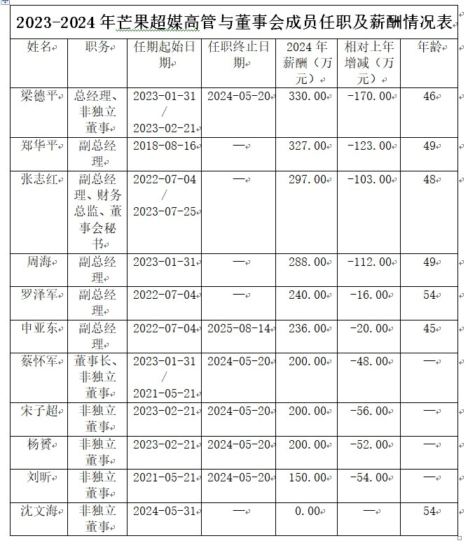 高管共 11 名,2023-2024年度總薪酬合計2468.00 萬元,對比芒果超媒年報,高官人員工資占比偏高。