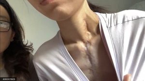 通过视频,张琦打开衣服让记者看,她胸前有从气管到腹部的手术长疤,还有一条从左胸到后背的刀痕,是她在不知情的情况下,被医生活摘了左肺;另外,她腋下赫然有一个大洞,每天必须换药清理。 母亲杜廷香说,原来腋下的洞口有拳头大,钳子伸进去有10厘米深,经过多次手术后,才把肺部空洞缩小。