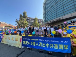 2025年8月10日,在纽约法拉盛唐人街图书馆前,全球退党中心举办活动庆祝4.5亿中国人成功三退(退党、退团、退队),有25人在现场公开宣布退党,领取退党证书。(大纪元)