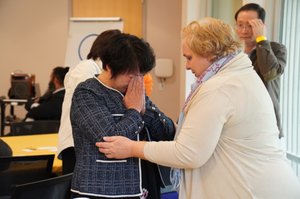 與會者梅格‧弗拉納根(Meg Flanagan)(右)女士在聽到遲麗華的故事後深感震驚,並和遲麗華擁抱。(張奕/大紀元)