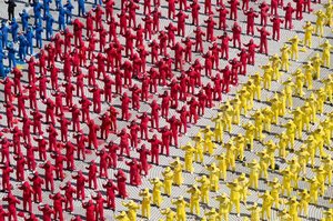 全世界最大“法轮图形及‘法轮常转’”图像 台湾法轮功排字至今已26年,学建筑出身的吴清祥每年都担任图像设计。吴清祥表示,今年法轮功学员排出“法轮图形及‘法轮常转’”图像,因为这个图像是早期台湾法轮功学员去中国跟大陆法轮功学员交流,第一次拿回台湾来的“法轮图形挂图”之一,所以排字的意涵,有“修炼不忘初心”的纪念性呈现。 吴清祥介绍,今天有逾五千位法轮功学员参加排字,今年排字图像中,直径超过66公尺的“法轮图形”,是法轮大法的标志,中间是一个大卍字符,四周四个小卍字符,以及两个上红下蓝、两个上红下黑的太极。下方隶书体金色的“法轮常转”,每个字宽21公尺、高17公尺。他说,每年排字都会上网,有中国民众在网路留言说:“好壮观、好殊胜!” 法轮功是一套以“真、善、忍”为核心理念的身心修炼功法。吴清祥说明,今年排出整体图像的意义,是象征法轮功从中国长春开传后,迅速传遍中国并洪传全球,一直在世界上度化人,至今已洪传世界逾110个国家及地区,并有越来越多的各族裔、不同肤色的人,相继结缘喜得大法,身心受益。 吴清祥表示,排字难度逐年提升,需克服天气、场地等不确定因素。他担任排字协调人将场地分10个区,各区各有负责人,很重视与大家沟通与互相配合,确保活动顺利完成。所有法轮功学员在排字过程中,遇到矛盾要按“真、善、忍”要求自己,能吃苦、有耐心、互相包容形成整体,并从中获得身心灵的提升。