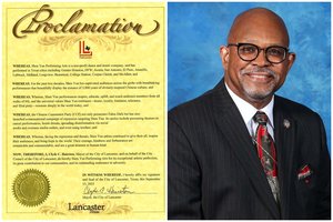2025年9月15日,德克薩斯州蘭卡斯特市市長克萊德‧C.海爾斯頓(Clyde C. Hairston)向神韻頒發褒獎。(明慧網)