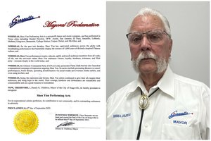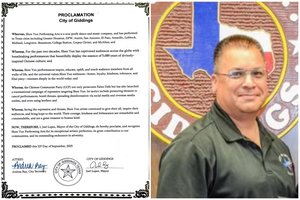 2025年9月22日,德克薩斯州吉丁斯市長喬‧洛佩茲向神韻藝術團頒發褒獎。(明慧網)