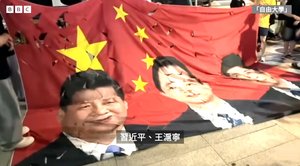 韩国年轻人在反共反中的抗议中,撕碎了中共国的五星旗,以及习近平、王沪宁等人的画像。(视频截图/BBC)