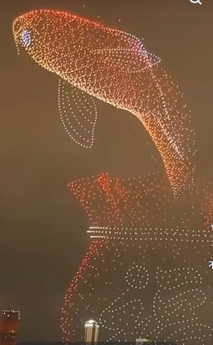 10月6号,大陆重庆举办无人机表演,夜空中突然出现一条巨大的,五彩缤纷的「锦鲤」图案,在场观众随即激动的高喊「于朦胧」。(视频截图)
