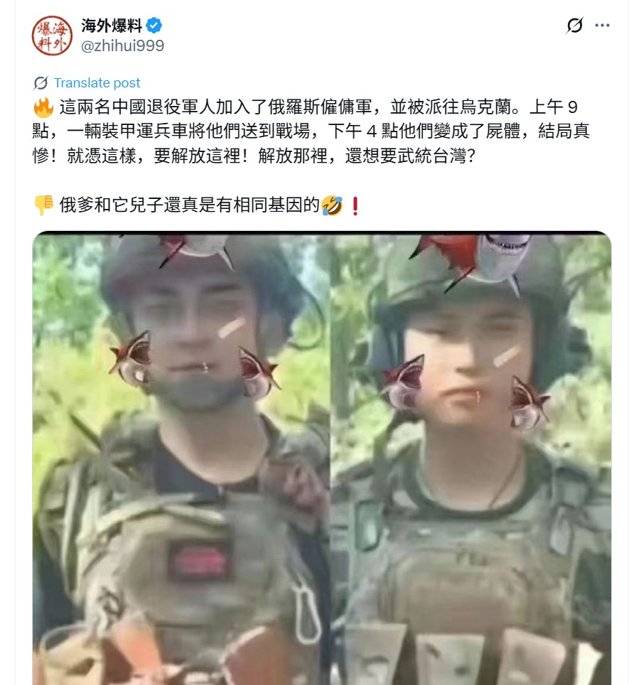 上面的图片记载的是另外一个故事,X平台用户“海外爆料”发帖表示:“这俩名中国退役军人加入了俄罗斯雇佣军,并被派往乌克兰。上午 9 点,一辆装甲运兵车将他们送到战场,下午 4 点他们变成了尸体,结局真惨!就凭这样,要解放这里!解放那里,还想要武统台湾?俄爹和它儿子还真是有相同基因的。”