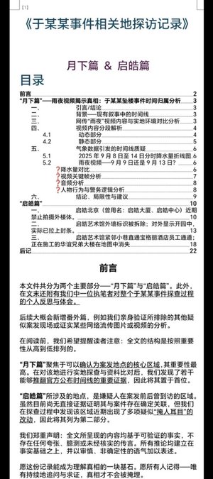 11月12號,海外X博主「新聞調查」發布了一份關於于朦朧案的調查報告。這份報告由外地女網友辭職組團赴京,實地調查陽光上東、寶格麗酒店、啟皓藝術館後,根據環境、氣象、視頻、音頻、人物行為、警方邏輯撰寫的一份專業調查報告。這應該是于朦朧事件發生2個月以來,最全面、邏輯最清晰、最客觀公正的報告。分為月下篇、啟皓篇和後記3部分。這份報告直接質疑了警方,報告認為真正的案發日期是9月9號。