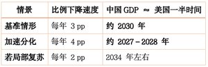 可以清晰地看到: .2010年–2021年是“追赶的黄金十年”; .2021年之后,则进入“重新拉开的新阶段”。 换句话说,中国的追赶在2021年触顶,而美国的领先又开始扩大,中国和美国的差距平均每年下降约3个百分点。 若按现行趋势推算,如下图: