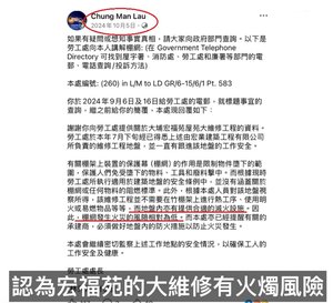 有小區住戶在網上的爆料顯示,宏福苑大維修公告顯示:棚架工程由「宏業建築工程有限公司」承建,使用山東某化纖繩公司提供,還貼出有「濱州市檢驗檢測中心」發出的合格證明書。 有市民在網上反映,這場大火的罪魁是防火能力不合格的紗網?保安局局長鄧炳強表示,消防員在救火時發現大廈外牆的保護網及防水帆布等受火後的蔓延程度較合規格的物料猛烈及快速,又在部分單位玻璃窗發現貼有發泡膠板,認為有關情況不尋常。當局會深入調查,包括循刑事方向調查。 據港九搭棚同敬工會理事長何炳德表示,以一張18米乘2米大小的網為例,有阻燃性能約75至90多元,沒有阻燃性能約56元,成本差距甚大,「另外,一張網阻燃物料越多,重量越重,日曬雨淋下容易穿洞,通常只用一次就扔;普通網除了便宜、輕身,更可多次重用」。他還注意到,宏福苑8座大廈同時維修,決定上欠缺安全意識,「入面有人居住,有老有少,起火時很難避難。另據我所知,棚架已擺放1年多,時間越長,風險越大,所以我們建議所有維修工程應縮短工期」。 香港工程師學會消防分部事務委員區家豪表示,屋宇署規定保護網、保護幕及防水油布等材料的阻燃性能,不排除竹棚內有報紙、木材等易燃物,導致火乘風勢迅速蔓延。他指出,當局除了要調查物料是否達標,也應做好消防安全教育,「一些人在旁邊燒焊或吸煙,都有機會是起火源頭,如果不制止,就算有很好的配件,也有機會發生火災」。 而消防處處長楊恩健透露,屋苑大廈有通風窗用易燃性高發泡膠封著,情況不尋常,會轉交警方調查。△