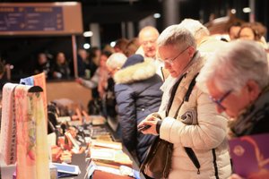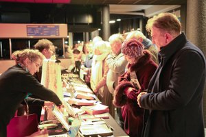 2025年12月18日,觀眾在阿姆內維爾大劇院(Galaxie Amnéville)內購買神韻商品和《轉法輪》等書籍。(章樂/大紀元)