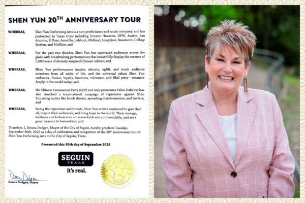 【人民報消息】神韻藝術團即將在2026演出季中,迎來巡迴演出20周年。美國德克薩斯州繼六城市嘉獎神韻(請看這裡)後,又有埃爾帕索市(El Paso)、加蘭市(Garland)、麥卡倫市(McAllen)、朗維尤市(Longview)、塞金市(Seguin)和伯尼市(Boerne)六座城市的市長,代表市議會向神韻致贈褒獎。 神韻是「人類珍貴典範」 他們在褒獎公告中寫道,神韻藝術團為非營利性樂舞團體,二十年來巡迴演出足跡遍及德州各大城市(包括大休士頓地區、達拉斯-沃斯堡、奧斯汀、聖安東尼奧、埃爾帕索、阿馬里洛、拉伯克、米德蘭、朗維尤、博蒙特、大學城、科珀斯克里斯蒂及麥卡倫等)。 市長們一致稱讚,神韻以震撼人心的演出,生動展現五千年神傳中華文化的精髓,令全球觀眾為之傾倒;演出激勵、教化、鼓舞並觸動各階層觀眾,弘揚「忠、義、仁、恕、孝」等普世價值,在當今世界引起深刻共鳴。 公告指出,中共不僅迫害法輪功,更發動跨國打壓神韻的行動,手段包括施壓劇院取消演出、散布炸彈威脅、通過社群平台及海外媒體散播虛假信息,甚至動用法律戰。然而,面對打壓與威脅,神韻藝術家們憑藉勇氣、慈悲與寬容,持續傳遞美、希望與啟迪;堅韌精神堪為全人類珍貴典範。 四座城市宣布「神韻日」
