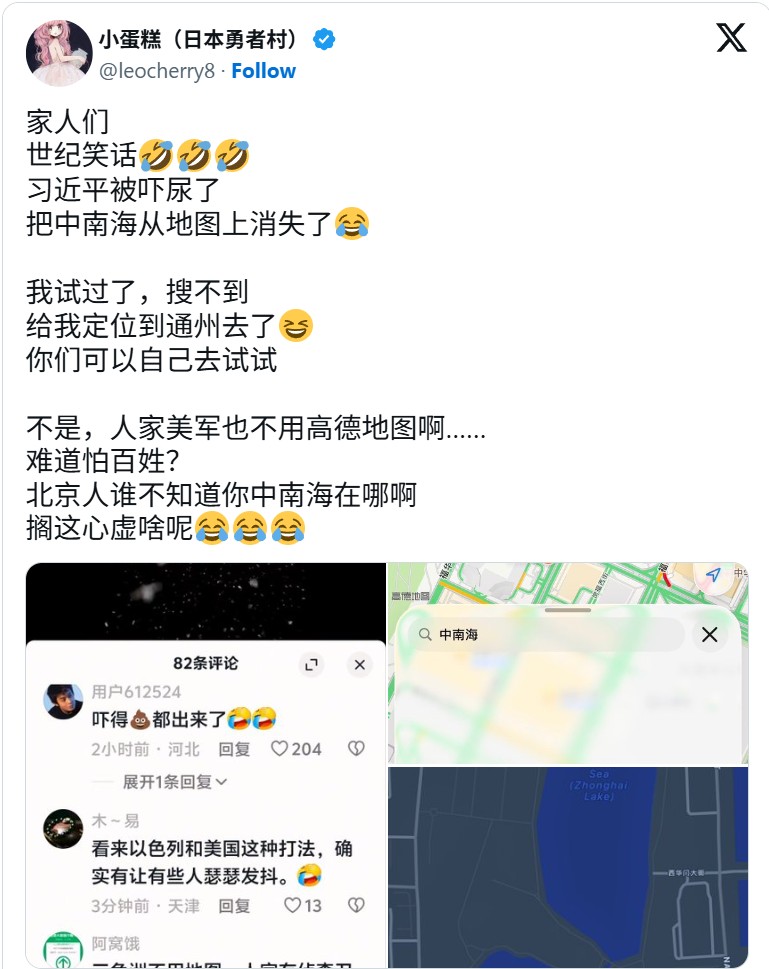 【人民报消息】(人民报记者金欣综合报导)美国近期对委内瑞拉总统马杜洛采取行动并逮捕,引发国际社会高度关注。在中国,一件突发事件暴露了中南海高官对于美军的“斩首”效率之高感到脊背发凉,他们毫不遮掩的采取的第一个保命方式,就是屏蔽中南海地图。有人嘲讽,这种鸵鸟战术,太雷人了。 近日有中国网友发现,中国三大地图应用程式,高德、百度与腾讯地图,已无法搜寻“中南海”关键字。相关截图显示,只要搜索“中南海”,系统回传:错误讯息,并建议改以其它地点搜寻。此一变动在网路上引发讨论,很多网友都联想到,美国在委内瑞拉的闪电式斩首行动,让中南海高官们吓尿裤子了。 外界猜测,中共可能担忧,美国逮捕马杜洛的行为将波及至中共党魁习近平和一众高官,因此将中共最高领导层的驻地:中南海从地图程式上撤下。因为“中南海”是中国共产党与中共政府最高权力中枢,不仅是多个核心机构的所在地,在中南海办公的中共高层领导人和高级干部的配偶和家人也可以居住在中南海。不过,网友们嘲讽,由于美军的行动并不依赖中国制造的地图程式,撤下地图的做法就是此地无银三百两。还有网友质疑“难道是怕百姓?北京人谁不知道你中南海在哪啊”。