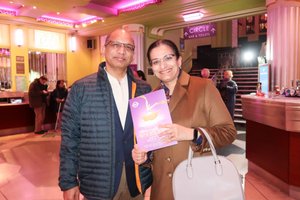 2026年1月14日下午,軟件架構師Padmini Chivukula與妻子Shyam Chivukula在英國倫敦漢默史密斯阿波羅劇院(Eventim Apollo),一同欣賞了神韻環球藝術團在當地的第二場演出。(詹娜/大紀元)