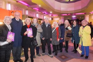 2026年1月14日下午,華人祝女士(右二)帶著11位英國朋友觀看了神韻環球藝術團在英國倫敦漢默史密斯阿波羅劇院(Eventim Apollo)的第二場演出。(麥蕾/大紀元)