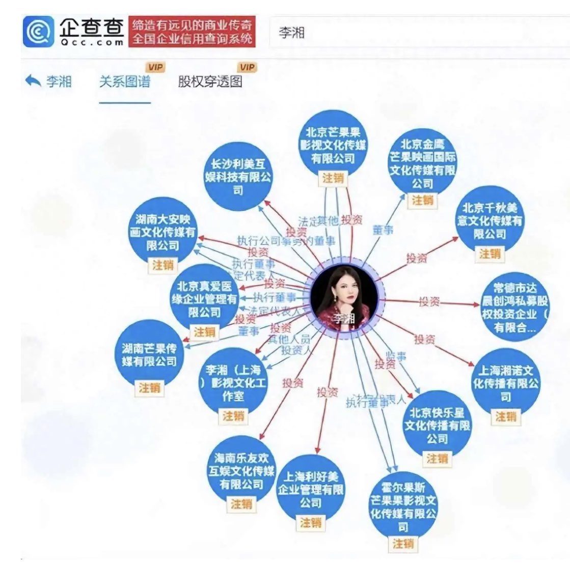 據企查查數據顯示,李湘名下20家關聯企業中,14家已在禁言當日凌晨顯示註銷。(網絡圖片)