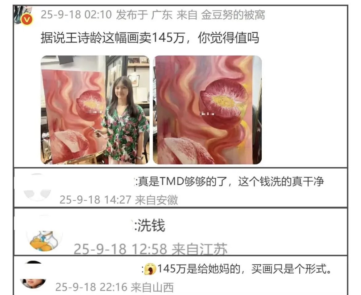 業內爆料說,打聽到消息,說是和稅務問題有關。知情人透露,密集註銷公司的本質是「切斷風險鏈條」,並且她的稅務問題已進入核查程序,只是暫時沒有公開通報。 第三種猜測是涉及經濟犯罪。去年12月,李湘的第一任前夫李厚霖因經濟犯罪被刑事拘留,李厚霖的哥哥妹妹也一同被抓。如今才過去一個月,李湘就被爆出問題。因此,不少網友紛紛質疑二人存在資產關聯。從房產到珠寶,李湘的錢真的乾淨嗎? 而在李湘被禁止關注後不久,又有人曝出大瓜,用外號指代內娛明星涉及金額巨大的洗錢。被網友解密出疑似牽扯李湘、趙薇、倪萍、李連杰等人。起因居然與從柬埔寨遣返回國的「百億電詐大佬」陳志有關。 陳志1月7號被遣返回中國 ,一週後,李湘賬號被禁,時間上的高度巧合,讓網友們產生了無限遐想。有傳聞稱,李湘可能通過名下企業或投資項目,為陳志的電詐集團提供了洗錢渠道;也有猜測認為,她可能參與了陳志集團的部分非法經營活動,從中獲利。但這些到目前爲止都是沒有證據的猜測。 不管李湘是否真的牽扯陳志洗錢大瓜,但早有網傳懷疑李湘洗錢,還牽扯到了女兒王詩齡。當年網傳王詩齡一幅「桃子圖」被拍到145萬,就有網友質疑畫作本身並不值這個價。還有網友想到韓劇《黑暗榮耀》曝光上流社會的洗錢操作,就是通過畫展買賣畫作而達成的,恰好王詩齡也辦過畫展。李湘還曾在社媒上炫耀王詩齡獲得某個國外獎項,聽著很是「高大上」,結果被一位英國網友戳穿,獎項含金量還不如社區文化館。李湘有故意給王詩齡畫作炒作的嫌疑。以王詩齡畫作水平,拍賣到145萬的高價背後是不是有什麽貓膩呢?