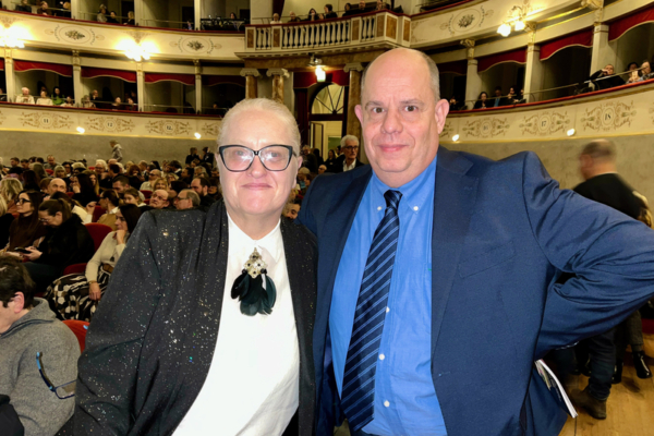 2026年1月27日晚,一家复古服装公司老板Simone Martini和太太Paola Bonacchi观赏了神韵纽约艺术团在利弗诺的戈尔多尼剧院(Teatro Goldoni)的首场演出(Leo Botnarenko/大纪元)。