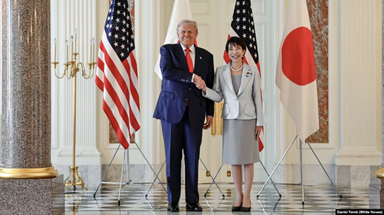 资料照片:2025年10月28日,川普总统在日本东京赤阪离宫与日本首相高市早苗会面。