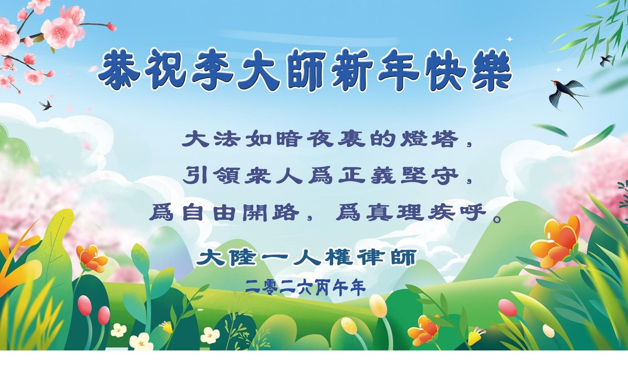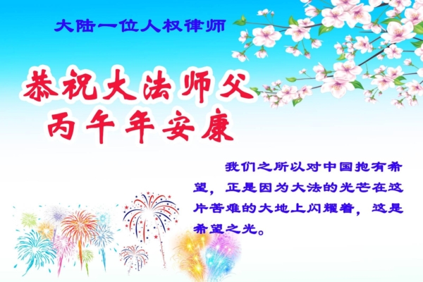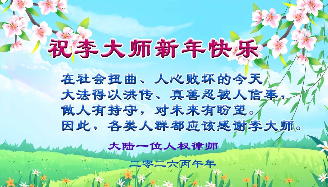 【人民報消息】中國黃曆新年到來之際,大陸多位人權律師和民眾接受採訪並發來賀信,表達他們對法輪大法及創始人李洪志先生的崇敬和祝福。 據大紀元記者程靜、洪寧採訪報導他們表示,在這片苦難大地上,法輪大法如暗夜裡的燈塔,是人類的希望,引領眾人為正義堅守,為真理疾呼;並表示「我們想念李大師!」「恭祝李大師新年快樂!」「盼望早日回到大陸」。 法輪大法(又稱法輪功)是由李洪志先生於1992年5月在中國長春傳出的佛家上乘修煉大法,是以「真、善、忍」為指導原則修煉,迄今已洪傳逾110個國家,獲得萬個以上褒獎,億萬人民身心受益。每逢佳節,人們紛紛表達對李洪志先生的感恩。 大法洪傳 未來有盼望 大陸人權律師王興給大紀元發來賀卡。王興說,「在社會扭曲、人心敗壞的當今,大法得以洪傳、真善忍被人信奉,做人有操守,對未來有盼望。」 「因此,各類人群都應該感謝李大師。」 「祝李大師新年快樂!」