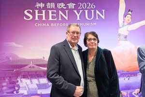 2026年2月26日下午,Robert Moir先生和太太Kathleen Moir一同觀看了神韻環球藝術團在英國海威科姆-威科姆天鵝劇院(Wycombe Swan Theatre)的第五場演出。(James Xu / 大紀元)