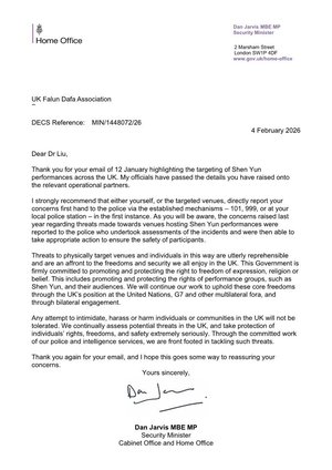【人民報消息】2026年2月4日,英國安全事務部長丹・賈維斯(Dan Jarvis)議員致函英國法輪大法學會表示,對神韻演出劇場和相關個人,實施人身攻擊的威脅行為極其惡劣,是公然侵犯英國社會所共同享有的自由與安全。 賈維斯重申,任何試圖在英國境內恐嚇、騷擾或傷害個人或社群的行為,都是不可容忍的,英國政府採取積極主動的態度來應對和打擊此類威脅。 明慧網報導,這是繼1月23日英國外交部致函英國法輪大法學會、明確表達政府堅決反對中共特務以恐嚇方式干擾神韻演出的立場之後,英國政府再次就相關問題作出清晰表態。作為英國政府中專門負責反恐、應對外國敵對勢力威脅與公眾安全事務的高級官員,賈維斯的回函進一步重申了政府在此問題上的堅定立場。 英國安全事務部長:威脅行為極其惡劣 回信中,賈維斯首先回應了神韻在英國演出期間遭到中共特務及其幫凶威脅的情況,並表達了政府層面的高度重視。 他寫道:「感謝您於1月12日來信,反映神韻藝術團在英國各地演出遭到針對的問題。我的官員已將您提出的相關情況轉交給相應的執法與安全合作部門。正如您所知,去年有關對舉辦神韻演出的劇院發出威脅的情況已向警方報案,警方對相關事件進行了評估,並採取了適當措施,以確保相關人員的安全。」 神韻藝術團於2006年成立於紐約,以恢復中國傳統文化為宗旨,「展示共產主義之前的中國」,其精湛的藝術風格再現仁、義、禮、智、信等普世價值,20年來世界巡迴演出,吸引了數百萬觀眾,深受各國主流社會喜愛,但長期以來一直是中共政權攻擊的目標。 著名法律學者、原北京大學法律系教授袁紅冰2025年6月在美國國會大樓舉行的「中共升級跨國鎮壓」的國會論壇上表示,習近平在2022年底下令的新一輪升級跨國鎮壓的攻勢,首要針對法輪功和神韻,並主要通過「輿論戰」和「法律戰」來實施。 隨之而來的是,近年中共的威脅和干擾加劇,包括死亡威脅、炸彈威脅、以及假冒身分者的暴力攻擊威脅,還有中共使領館發布抹黑文章,以及利用被其滲透的西方媒體,比如《紐約時報》等扭曲事實,攻擊神韻,再配以中共喉舌和網軍發動輿論攻勢。 這些威脅被發送給世界各地舉辦神韻演出的劇院,作惡者在發出威脅時,通常會冒充政府官員、媒體記者、中國異議人士。 賈維斯嚴厲譴責針對神韻演出及劇院的恐嚇行為,強調英國政府有責任切實保護演出團體及其觀眾的合法權益。 他指出:「以這種方式威脅劇院和實施人身攻擊的行為極其惡劣,公然侵犯了我們在英國所共同享有的自由與安全。本屆政府堅定致力於促進和保護言論自由、宗教或信仰自由。這其中包括促進和保護諸如神韻這樣的演出團體及其觀眾的權利。」 賈維斯也談到政府在維護核心價值觀的努力:「我們將繼續通過英國在聯合國、七國集團(G7)及其它多邊機制中的立場,以及通過雙邊交流,來維護這些核心自由。」 在信函結尾,他再次強調英國政府對相關威脅「零容忍」的態度:「任何試圖在英國境內恐嚇、騷擾或傷害個人或社群的行為,都是不可容忍的。我們持續評估英國面臨的潛在威脅,並高度重視對個人權利、自由與安全的保護。在警方和情報部門的共同努力下,我們始終採取積極主動的態度來應對和打擊此類威脅。」