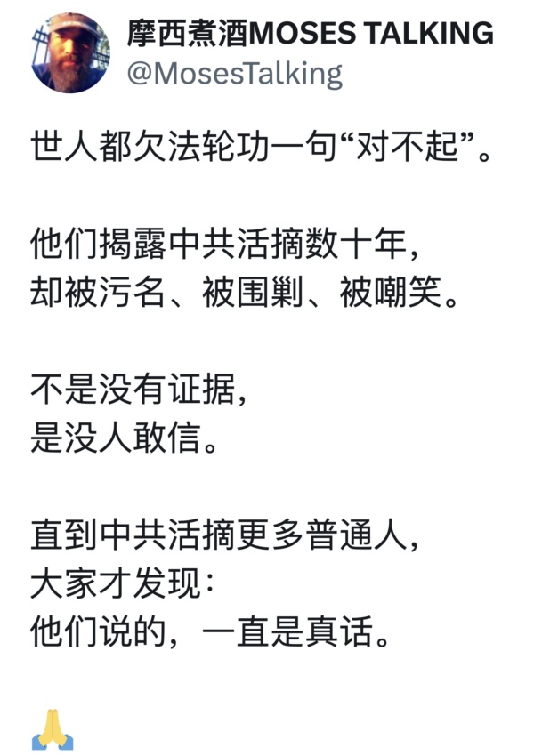 【人民报消息】旅美知名博主“摩西煮酒”近日在X平台发文,称“世人都欠法轮功一句对不起”,引发网友热议。在接受大纪元采访时,他反思了自己从不相信,到认同活摘器官真相的心路历程,并表示:“历史最大的悲剧,不是没有警告,而是警告出现时没有人相信。”他直言:在一个普遍说谎的时代,说出真相需要勇气。