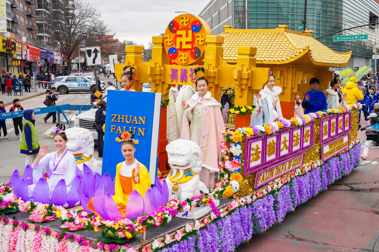 2026年2月21日丙午马年大年初五,法轮功学员参加纽约法拉盛中国新年游行,带去美好和祝福。图为“天宫仙境”花车。(张静怡/大纪元)