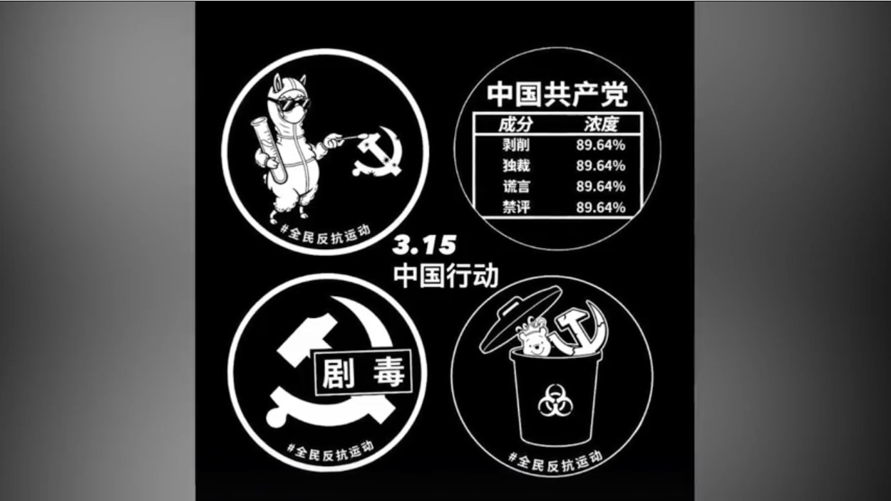 投影画面包括四组图像。第一幅画面显示一只身穿防护服的卡通羊驼形象手持试管,对带有新冠病毒图案的镰刀锤子标志进行“核酸检测”。第二幅画面模仿产品标签,标示“中国共产党”的四项“成分”为“剥削”“独裁”“谎言”与“禁评”。第三幅画面在镰刀锤子图案上叠加“剧毒”警示标志。最后一幅画面则将相关图案投入标有生物危害标志的垃圾桶。