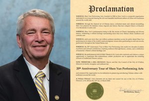 市长Bill Hennessy表示,“神韵艺术团于2006年在纽约成立,是一个非营利组织,致力于复兴并向世界各地观众共襄盛举中国丰富而博大精深的传统文化……展现了数千年来塑造中国文明的永恒价值、传说与历史。”