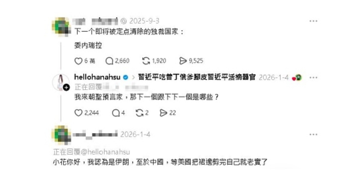 这位预言家早在去年9月3日在社群媒体Threads发帖文预测:“下一个即将被定点清除的独裁国家是委内瑞拉。”4个月后,美军在今年1月3日凌晨闪电突击委内瑞拉,活捉了委国独裁者马杜罗,震惊全球,这则帖文也立即引发网友高度关注。