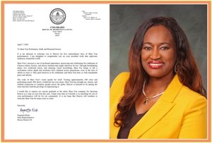 2026年4月7日,科羅拉多州眾議員Naquetta Ricks發來賀信,恭賀神韻藝術團蒞臨科羅拉多州。圖為Naquetta Ricks議員和其賀信。(公有領域、大紀元)