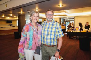 2026年4月8日下午,前銀行總裁兼首席執行官、扶輪社社長Donna Petrocco(左)與友人Bill Bathurst一起欣賞了神韻北美藝術團在美國丹佛市布爾劇院(The Buell Theatre)的首場演出。(林慧心/大紀元)