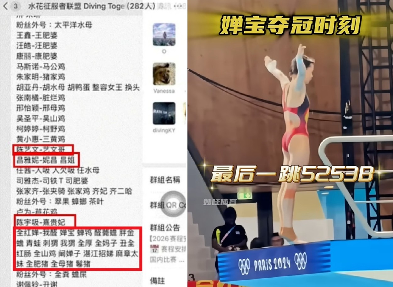 右圖:全紅嬋在2024年巴黎奧運會上奪冠的最關鍵一跳。做圖:參與辱罵全紅嬋的名單曝光。(視頻截圖)