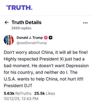 分析:川普发重磅帖文 美中关系濒临破裂 2025/10/12 (1,599次) 📝