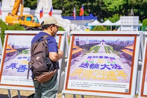 2025年10月18日,来自台湾、美加日韩、香港等地的部分法轮功学员逾五千人,在台北中正纪念堂自由广场举办排字活动。图为民众观看法轮功真相看板。(赵郁诚/大纪元)