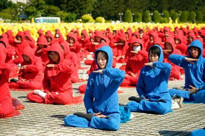 2025年10月18日,来自台湾、美加日韩、香港等地的部分法轮功学员逾五千人,在台北中正纪念堂自由广场,排出巨型的“法轮图形及‘法轮常转’”图像。图为法轮功学员大炼功活动。(宋碧龙/大纪元)