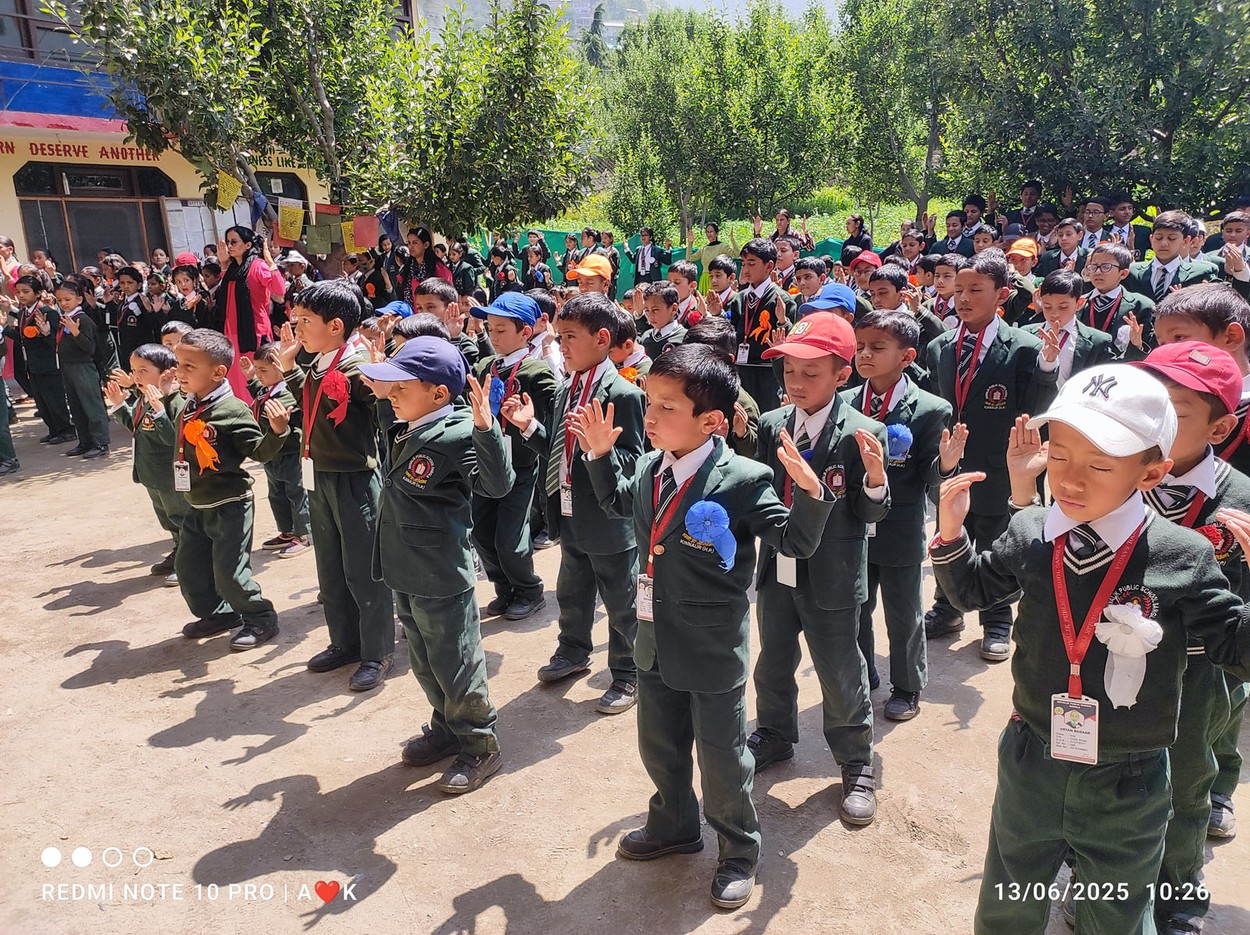 2025年3月至6月,法輪功學員到印度喜馬拉雅山區的學校裡教學生們煉法輪功。(明慧網)