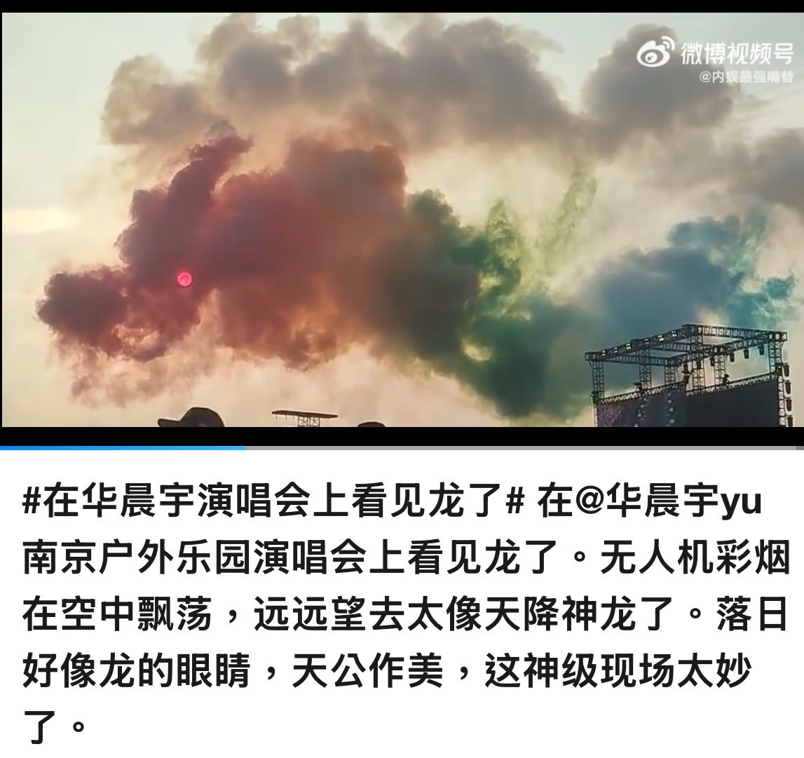 10月5日華晨宇南京演唱會,無人機彩煙彌漫飄蕩在天空中,最後幻化為龍形。網友淚崩感嘆:「是龍兒來看他的兄弟了」。(視頻截圖)