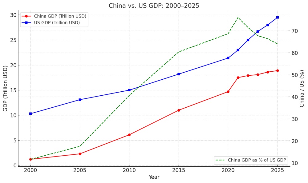 【人民報消息】2000年初,世界普遍相信「中國奇蹟」將改寫全球經濟格局,中國經濟總量將趕超美國;但21世紀20年代中期,歷史出現了出人意料的逆轉——不是中國在趕超美國,而是美國在大步甩開中國。 .在過去二十年,中美經濟關係經歷了一次歷史級反轉,如下圖: