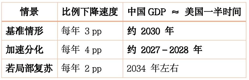 可以清晰地看到: .2010年–2021年是「追趕的黃金十年」; .2021年之後,則進入「重新拉開的新階段」。 換句話說,中國的追趕在2021年觸頂,而美國的領先又開始擴大,中國和美國的差距平均每年下降約3個百分點。 若按現行趨勢推算,如下圖: