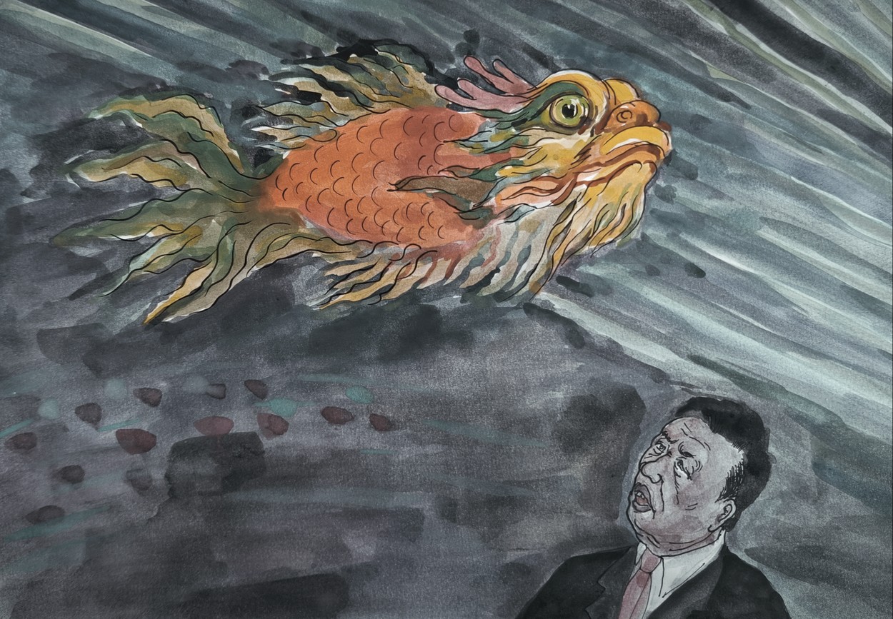 11月9号,中共党魁习近平出席了在广州举行的第十五届全国运动会开幕式。表演场上一度出现一条龙头、鱼身的空飘鳌鱼,令人联想到“于朦胧”。(清玉/人民报制图)