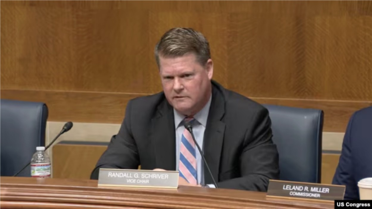 美中经济与安全审查委员会副主席薛瑞福(Randall G.Schriver)在报告发布会上。(2025年11月18日)