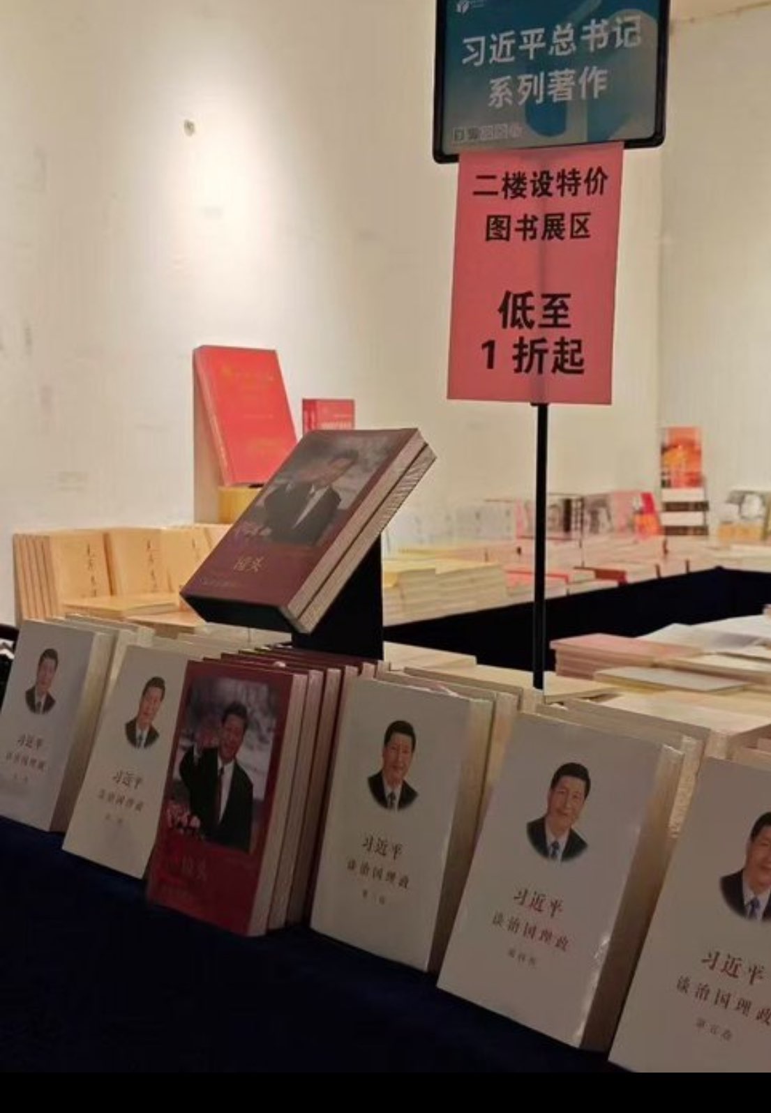 【人民報消息】在當下中國各大書店的顯眼位置,總能看到一排排以習近平名義出版的書籍,封面金光閃閃,定價不菲,卻常常落滿灰塵。照片中,那堆積如山的《習近平談治國理政》系列、《習近平著作選讀》,甚至打出「低至1折」的促銷牌子,依舊無人問津。
