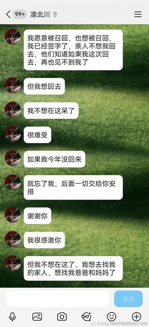 【人民报消息】11月21号,对墙内支持于朦胧的网友来说,是一个不平静的一天。有网友形容,很疯狂,战况激烈,所有为于朦胧在微博上发声的大V们的号全部被炸掉,而且新号刚出,一分钟就被封了。有2个年轻人在这场战役中,军后代凛北川不仅被造谣抹黑,还可能濒临生命危险。他的战友北行其野深夜被请去喝茶,社交媒体账号被跟踪,开一个炸一个。与此同时,大量的水军也在海内外出动,肆意把战局搅乱。邪恶突然如此疯狂,究竟为什么呢?一定是触动到了对方最大的利益。 于朦胧全球联署截至11月23号,已经69.8万,马上就到达70万。在加拿大多伦多,有一位网友把全球联署宣传单贴在了十几个地方,并表示会持续做下去。澳洲墨尔本的街头也出现了替于朦胧联署的宣传单。在美国纽约,于朦胧第三次登上了时代广场。 11月20号是寒衣节,是中国传统的祭祀节日,这个节日与清明、中元并称中国三大"鬼节"。主要习俗包括焚烧纸制寒衣以寄托对逝者的思念。很多网友给于朦胧烧纸送寒衣。有网友在烧纸时发现一个神奇的现象,有一个紫色的光圈一直在徘徊,网友认为,这是于朦胧来接受能量了。 军后代凛北川在11月21号晚上遭遇了水军猛烈的阻击。在为于朦胧发声的网友中,他已经成为了一个灯塔似的存在。11月3号,他疑似被迫去了于朦胧案发地,阳光上东小区见几个人。此后,凛北川告诉北行其野,他被嫌疑人集体举报,任何人都不要联系他。因为与他联系就会被牵连。凛北川同时也告诉网友,于朦胧案是主线,要坚持寄信、打电话。如果可能就等他回来。此后,凛北川一直没有公开报过平安。 在上个月,凛北川举报了于朦胧案的主角,朝阳区公安分局局长毕波,并指向了中共公安部部长王小洪。 11月19号,北行其野公布了与凛北川最新的对话截图。凛北川到底遇到什么状况呢? 凛北川目前有两条路可以选,一是,签名认罪,承认自己引导、煽动网友,造成不利于社会稳定等罪名,然后被挂到蓝底白字上杀鸡敬猴。如果他承认了这个罪名,等于也打了所有发声网友的脸,在网络上支持于朦胧这条路也就更艰难了。 第二条路,被召回边防特战部队,二度入伍。边防特战部队是最苦最危险的地方,可能会有生命危险。 我们来看看凛北川是怎么说的:“我愿意被召回,也想被召回,我已经签字了,亲人不想我回去,他们知道如果我这次回去,再也见不到我了。但我想回去,我不想在这呆了,很难受。如果我今年没回来,就忘了我,后面一切交给你安排。谢谢你。但我不想在这了,我想去找我的家人,想找我爸爸和妈妈了。”