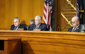 圖從左到右,分別是:共和黨籍聯邦眾議員、美國國會及行政當局中國委員會(CECC)共同主席克里斯‧史密斯(Chris Smith),共和黨籍聯邦參議員、CECC主席丹‧沙利文(Dan Sullivan),民主黨籍聯邦眾議員、CECC委員吉姆‧麥戈文(Jim McGovern)。(大紀元)