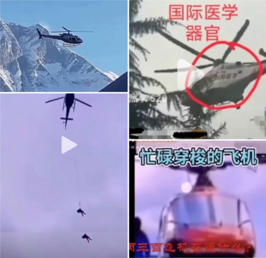 王相军在西藏无人区上空频繁拍到“国际医学”直升机来往穿梭,这些直升机被怀疑用来运送器官。(新唐人合成)