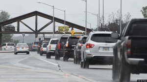资料照片:停在美国阿拉斯加州一个军事基地前的汽车。