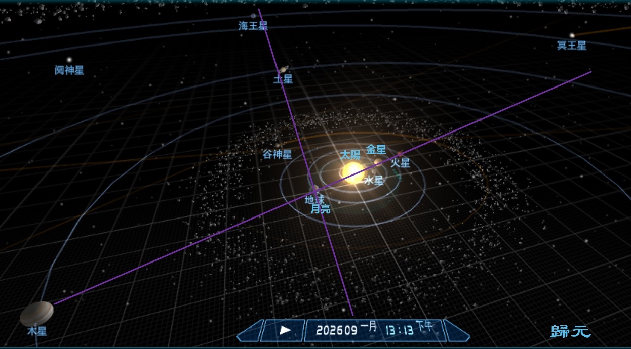 2026年1月9日太陽系六星連珠,地球上將看見日水金火四星8度合宿且與木星相沖、月亮與土星海王星相沖的天象(圖片來源:歸元制圖)