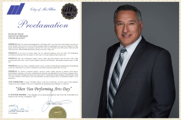 麥卡倫市市長哈維爾‧維拉洛博斯(Javier Villalobos)回顧道,神韻於2017年首度在該市登台,此後每年皆攜全新節目蒞臨里奧格蘭德河谷(Rio Grande Valley)。他強調:「神韻演出不僅激勵河谷居民,更為社區增添光彩;神韻將於2026年演出季重返麥卡倫,屆時將是這台精彩演出在本市舞台綻放10周年。」